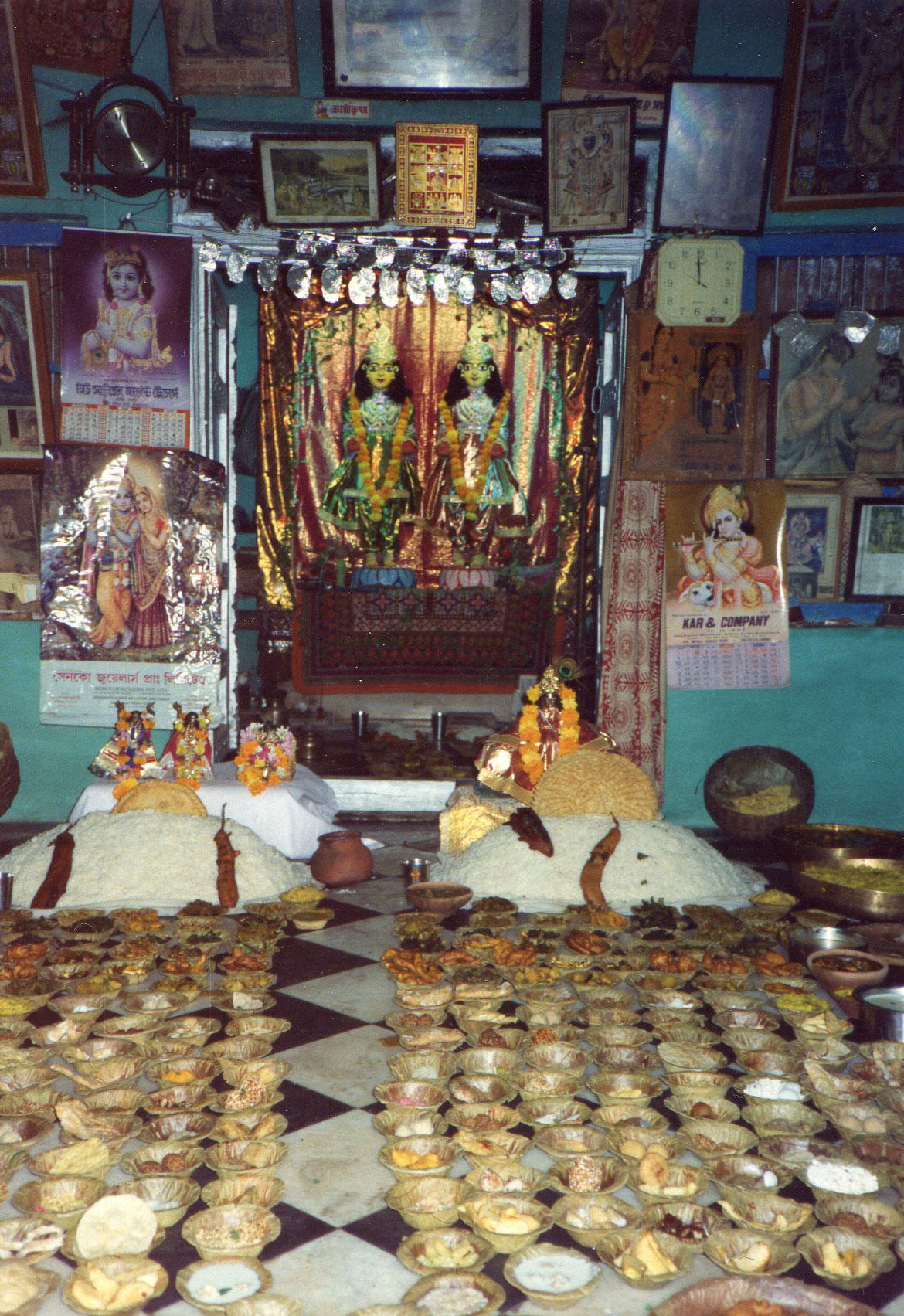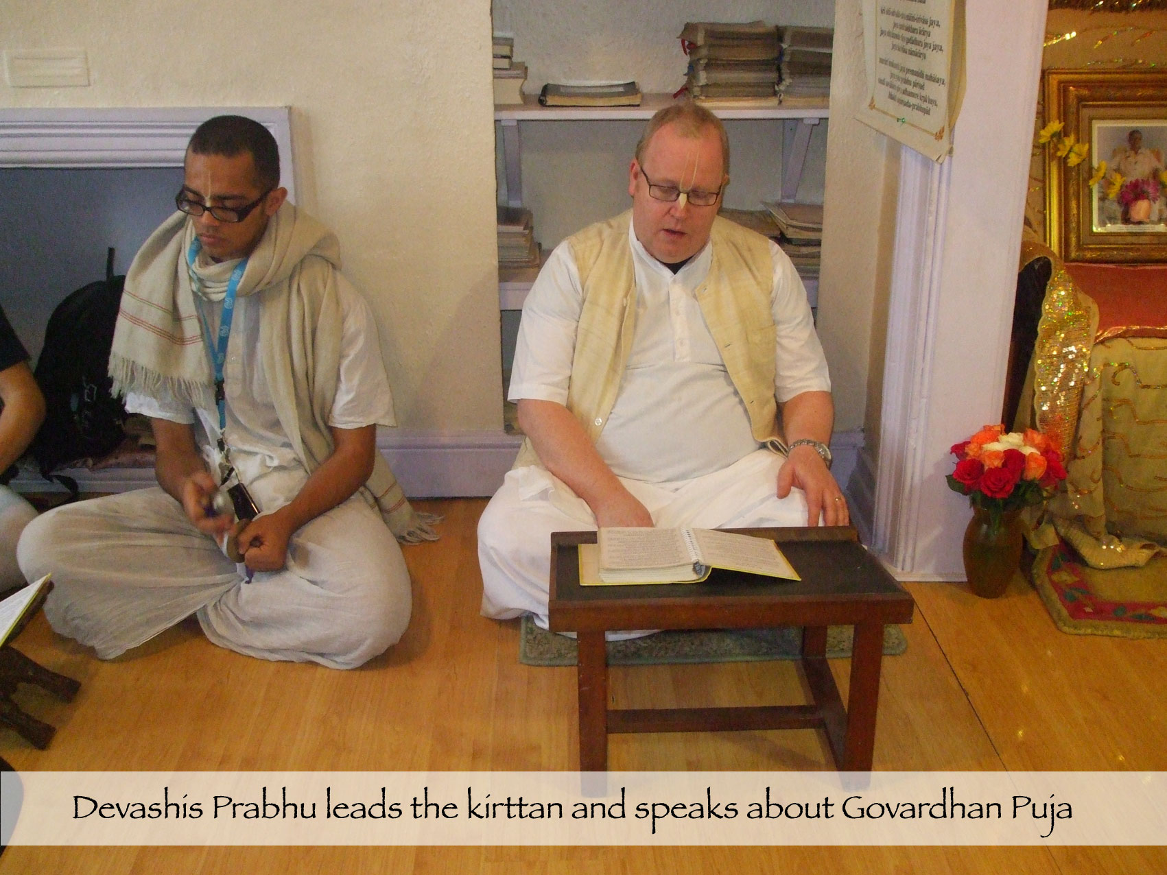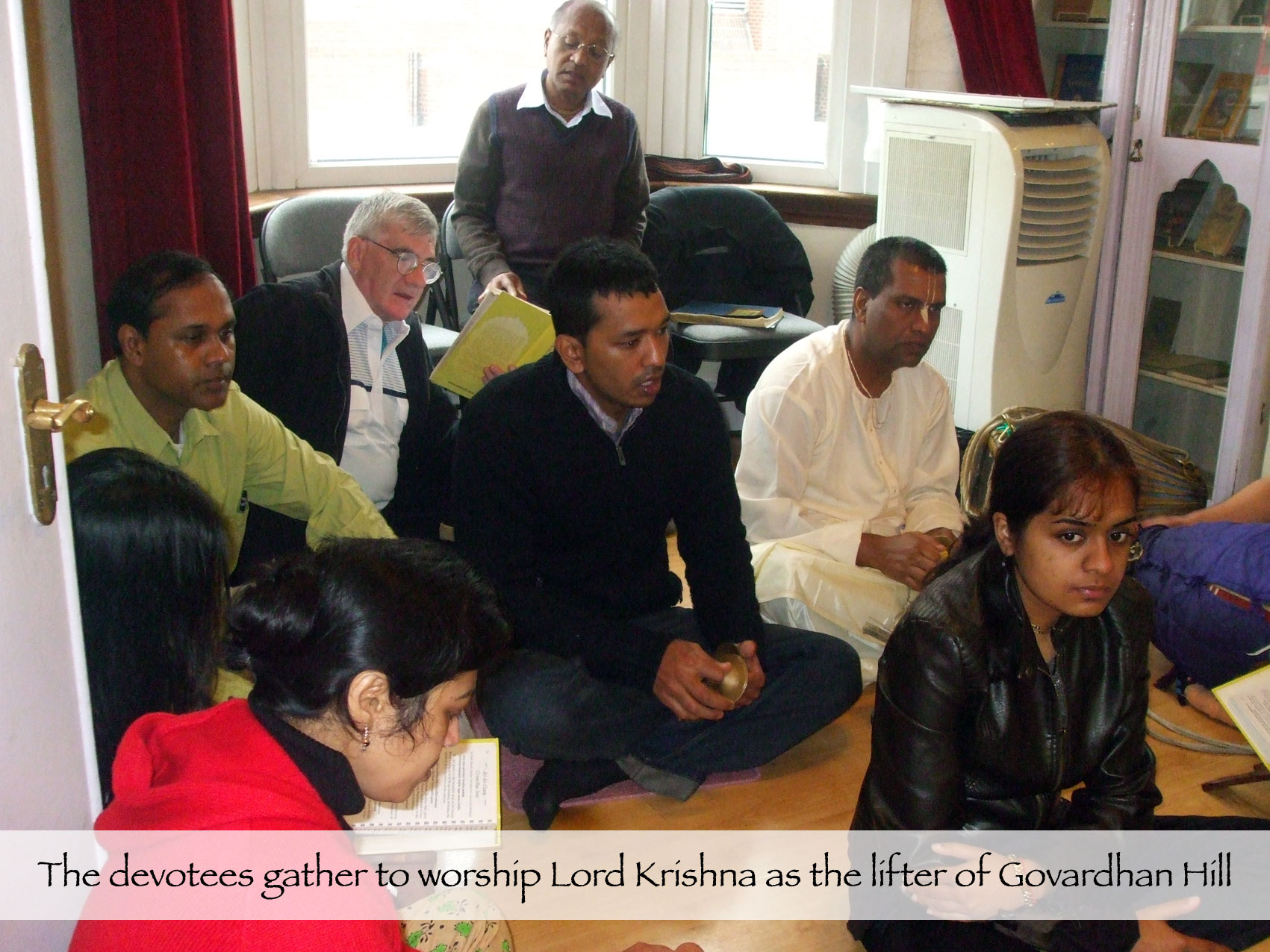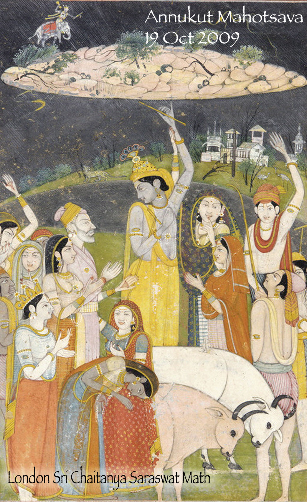 Instead of the traditional worship of Indra, the god of the elemental powers, Lord Krishna persuaded his father Nanda Maharaj to worship Govardhan. On this day the devotees offer Annukut (literally a mountain of foodstuffs) to the Lord and recall His pastimes of lifting the Hill to give shelter to the residents of Vrindavan from the floods sent by Indra to punish them for neglecting his worship.