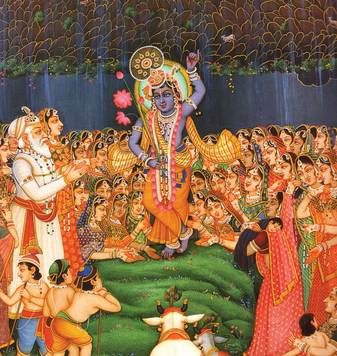 Krishna said, “Why should we perform this sacrifice to Indra? We have a direct concern with Govardhana Hill and not Indra.” He announced this idea to the gopas, and somehow, willingly or reluctantly, the gopas submitted to the advice of Krishna. Nanda Maharaja was influenced by affection for his son, and, because he was the king, he told them, “This time we shall worship Govardhana Hill and not Indra.”