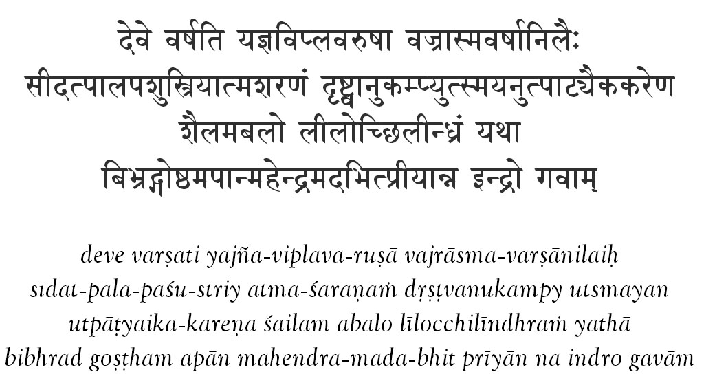Indra commanded the wind, the clouds, and the rain to go and devastate the whole area of Gokula Vrndavana. “The residents of Vrndavana have insulted me!” He said. “They have rejected me, have stopped worshiping me, and are instead worshiping that mountain, that hill of Govardhana. I can’t tolerate this insult! Go and devastate them.” By the order and wrath of Indra, the master of all the higher subtle elements, heavy rain began to fall. And so thunder, hail, and rain simultaneously attacked the whole of Vraja Mandala.